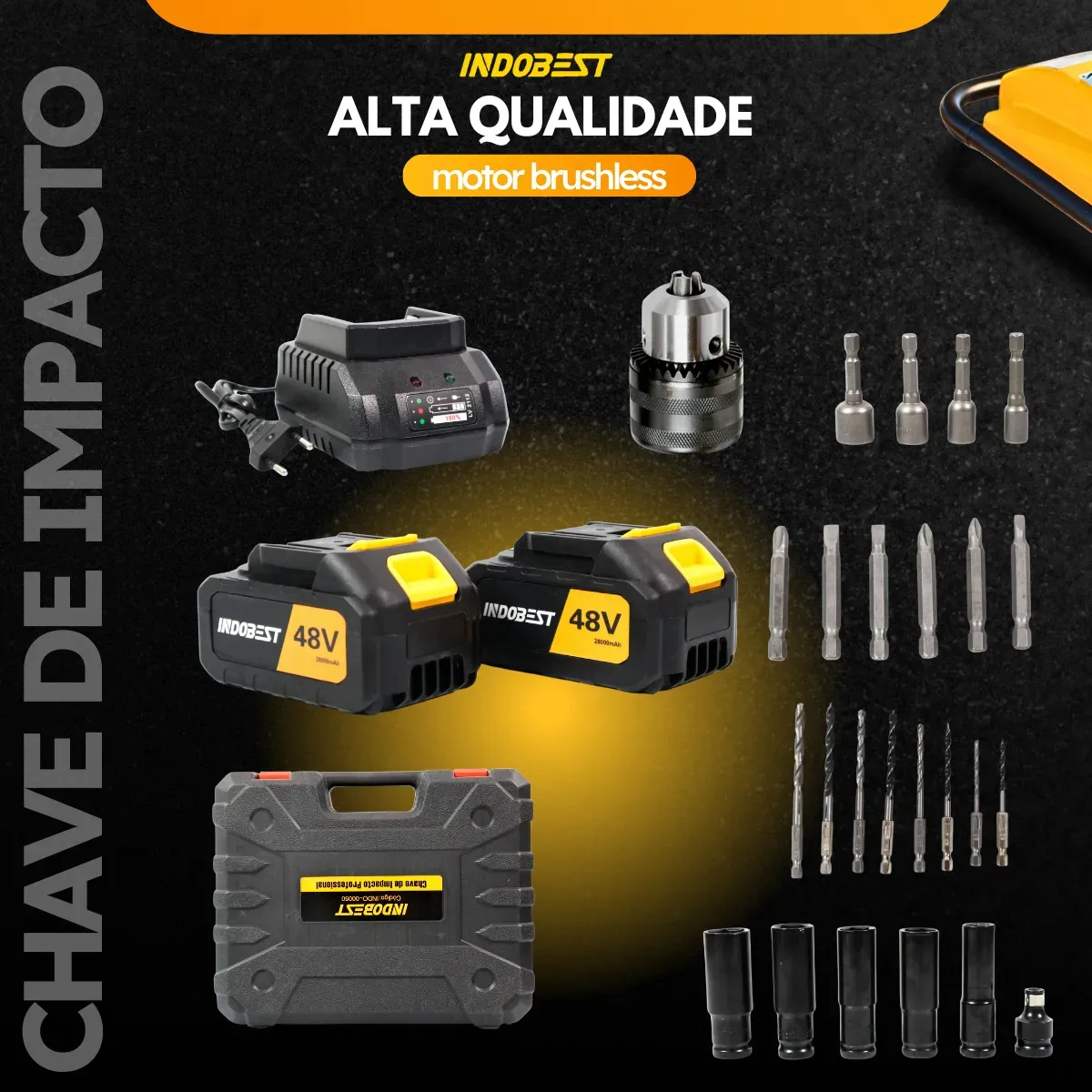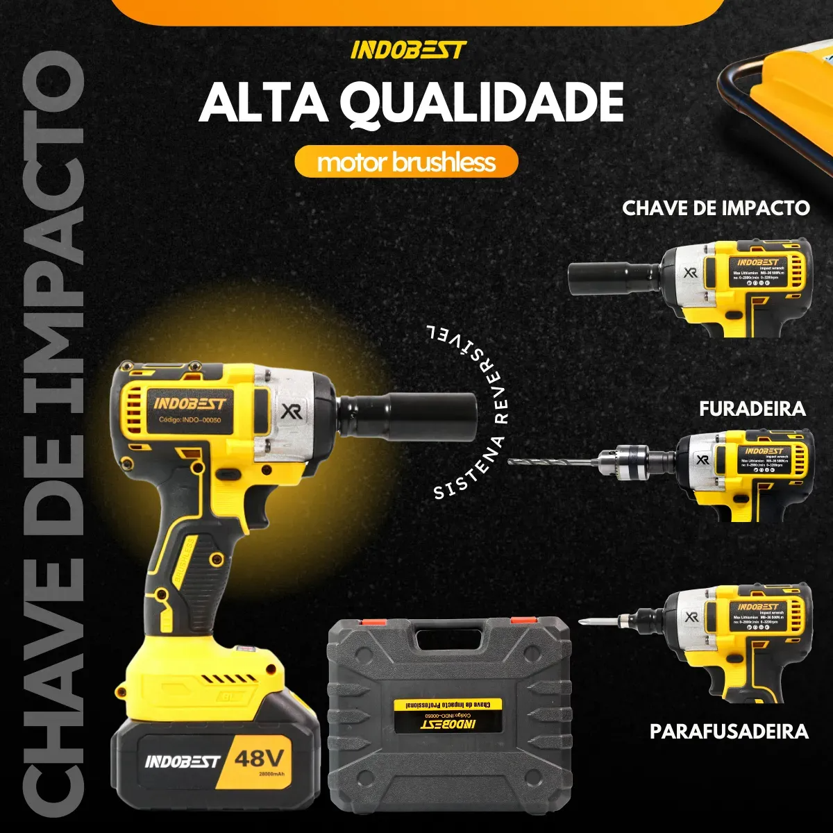 A Chave de Impacto Furadeira Recarregável 48V é uma ferramenta elétrica portátil desenvolvida para uso doméstico e aplicações gerais que exigem praticidade e mobilidade.